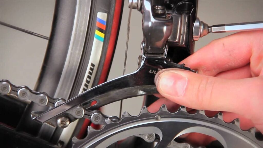 2. Ajuste de Altura: Mueve el desviador hacia arriba o hacia abajo hasta que la parte inferior exterior de la caja quede a 1-3 mm por encima de los dientes del plato más grande. Puedes usar una tarjeta de visita o una herramienta de ajuste específica como referencia.