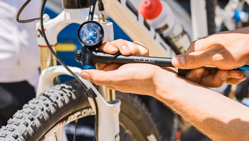 - Con la bomba, ajusta la presión de aire en la horquilla y el amortiguador según la recomendación del fabricante para tu peso.