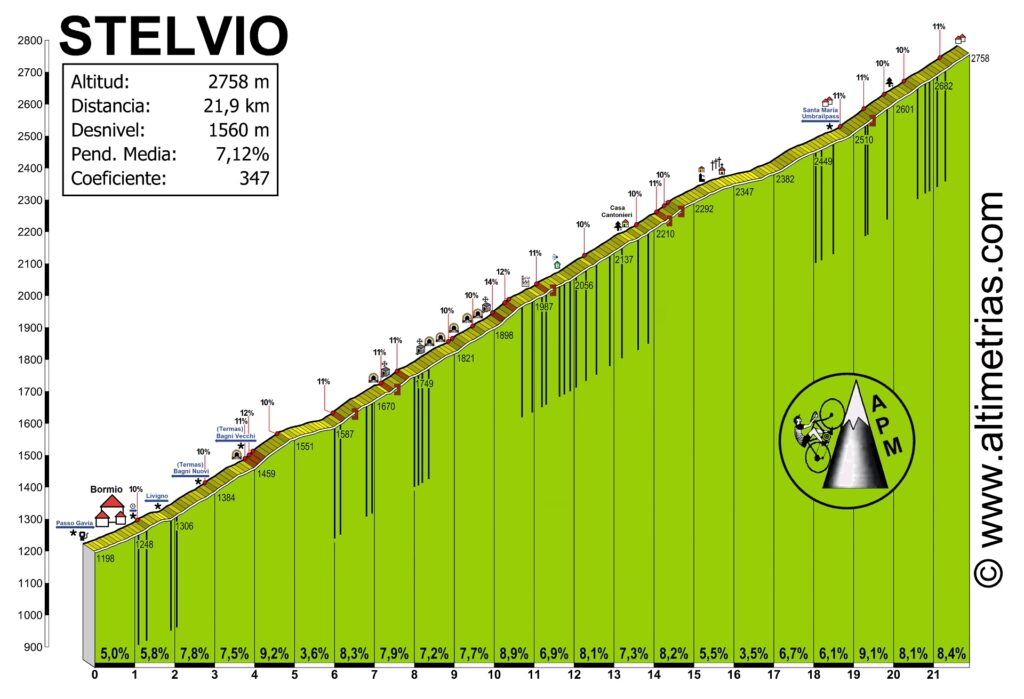 - Pendiente promedio (Umbrail a Stelvio): Elevada (parte final de Bormio)