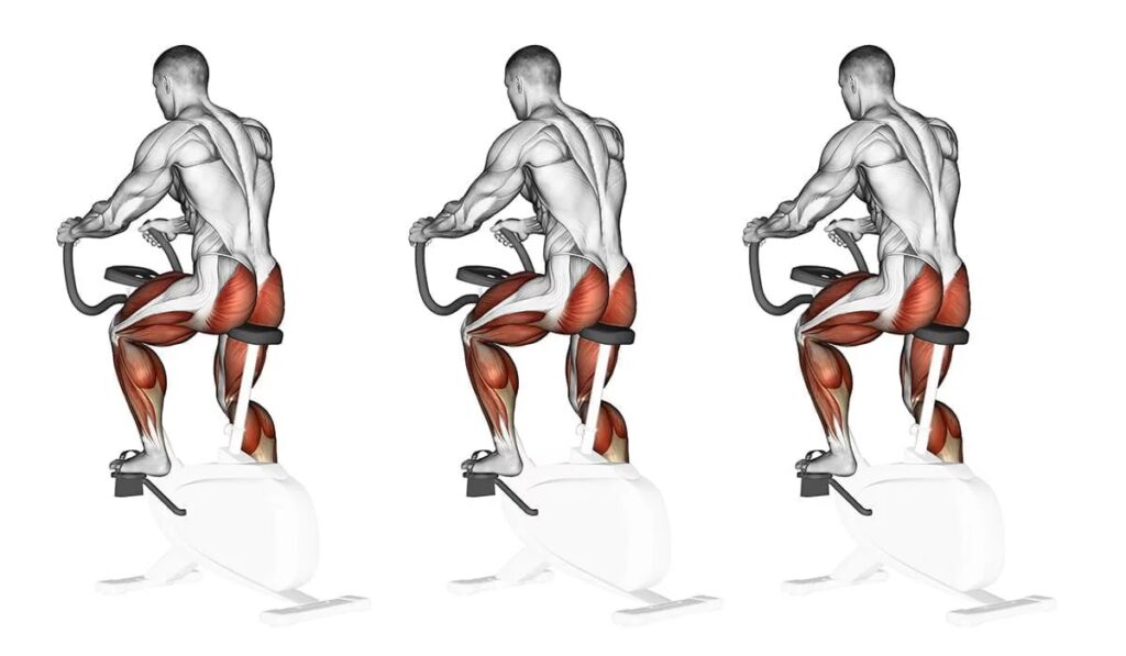 - Glúteos: Los músculos de los glúteos, especialmente el glúteo mayor, se activan al empujar el pedal hacia abajo, contribuyendo a la potencia del pedaleo. La activación de los glúteos puede ser mayor en bicicletas tipo spinning o al pedalear de pie.