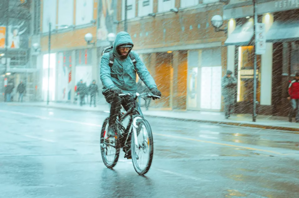 Pedalear bajo una lluvia ligera puede ser manejable, pero las tormentas eléctricas con rayos y vientos fuertes son extremadamente peligrosas. El riesgo de ser alcanzado por un rayo o de que caiga una rama de árbol es real. De igual forma, el ciclismo en condiciones de frío extremo combinado con lluvia aumenta drásticamente el riesgo de hipotermia, ya que el cuerpo mojado pierde calor mucho más rápido.
