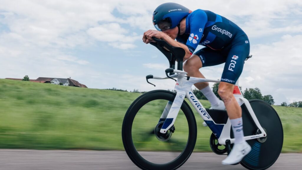 El ahorro de vatios es crucial en las pruebas de contrarreloj. Cada pequeño detalle cuenta, y la equipación del ciclista también está diseñada para complementar la aerodinámica de la bicicleta. Los cascos de contrarreloj tienen formas alargadas y lisas para guiar el aire sobre la espalda del ciclista. La ropa son monos de una sola pieza, ajustados al cuerpo, a menudo con mangas largas y sin cremalleras visibles, fabricados con tejidos texturizados para optimizar el flujo de aire. Incluso los cubrezapatillas aerodinámicos se utilizan para alisar la superficie de los pies y las zapatillas. Todo está calculado para reducir la resistencia al aire y permitir al ciclista ir lo más rápido posible.