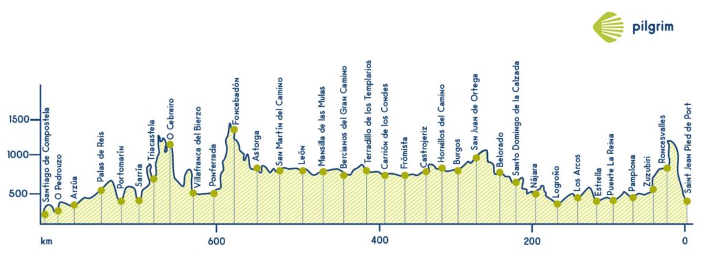 La primera etapa desde Roncesvalles, que llega hasta Zubiri (21.4 km con 800 metros de desnivel), ya implica un esfuerzo considerable al atravesar terreno montañoso en los Pirineos. Es una etapa que requiere estar preparado físicamente.