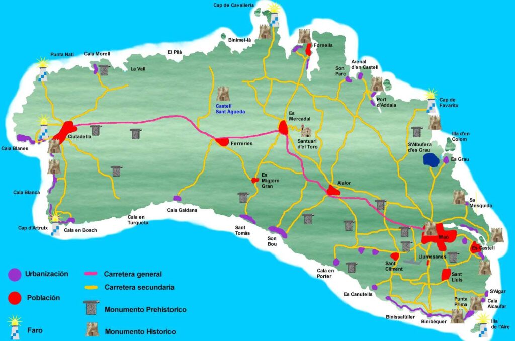Otros lugares destacados incluyen el Monte Toro, el punto más alto de la isla, que ofrece vistas panorámicas de 360 grados; calas famosas como Cala Macarelleta o Cala Algaiarens para relajarse; y pintorescos pueblos pesqueros como Binibeca Vell, con sus casas blancas y tiendas de artesanía.