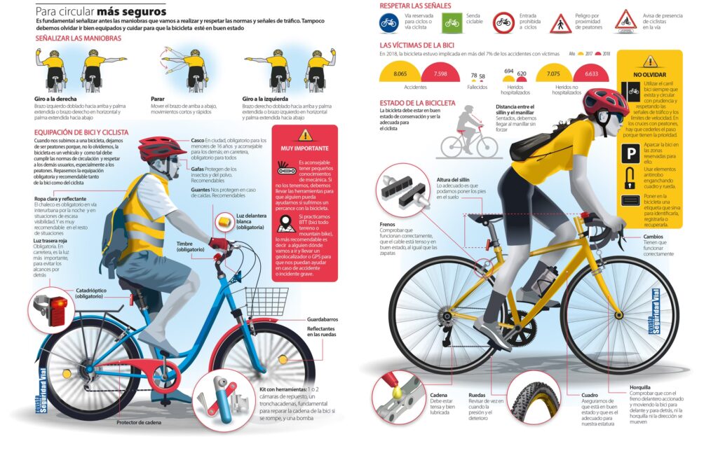 • Luces y Reflectores: En condiciones de baja visibilidad, como al anochecer, de noche, al amanecer, o en situaciones de niebla o lluvia intensa, es obligatorio equipar tu bicicleta con luces. Debes llevar una luz blanca en la parte delantera y una luz roja en la parte trasera. Además, es obligatorio llevar reflectores en los pedales y en las ruedas. Para aumentar aún más tu visibilidad, especialmente de noche en vías interurbanas, es muy recomendable (y en algunos casos, obligatorio) llevar un chaleco reflectante. La falta de visibilidad es una causa común de accidentes con ciclistas.