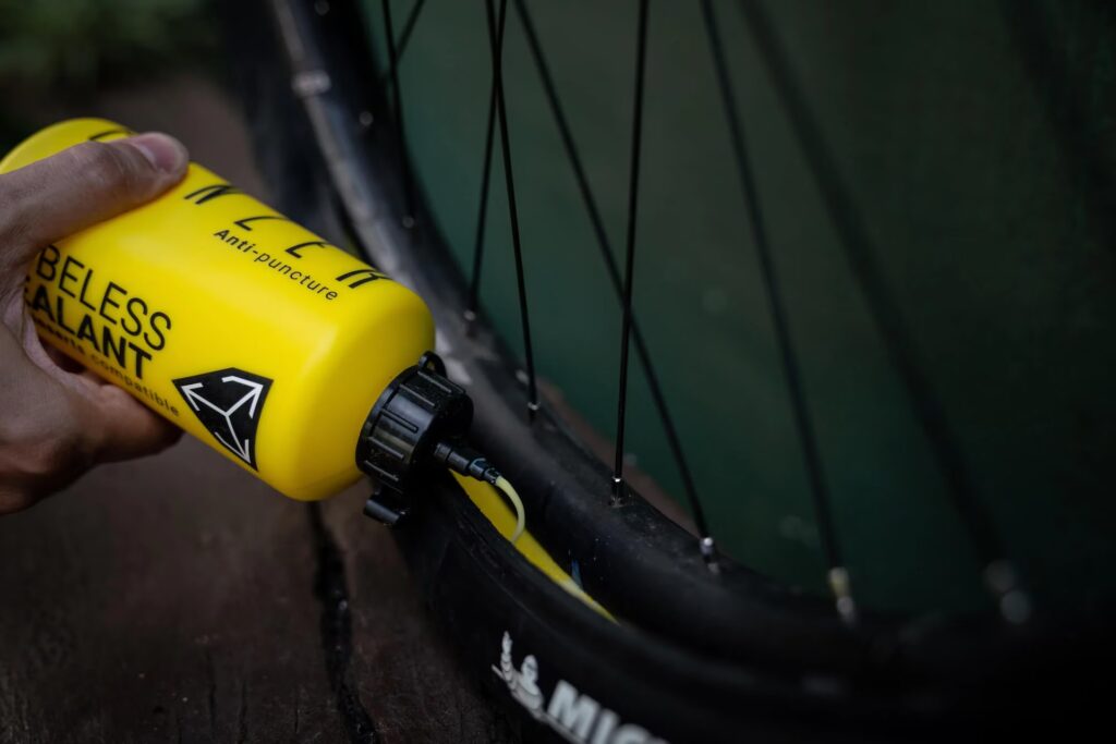 • Sellador Tubeless (Sealant): El líquido mágico. Se introduce dentro del neumático y es el encargado de sellar pequeños poros en el neumático y, crucialmente, taponar los pinchazos sobre la marcha.
