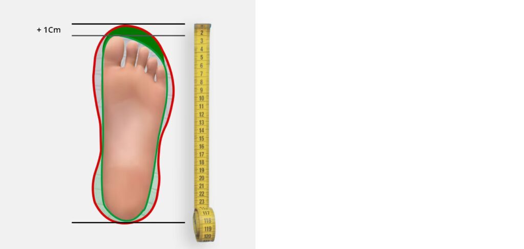 Mucho espacio (>1 cm) en la puntera al estar de pie.Zapatilla demasiado larga.Pie se desliza adelante y atrás, presión en dedos y talón.