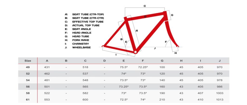 | Tamaño | Reach | Stack | Ángulo tubo dirección | Largo tubo dirección | Altura pedalier | Caída pedalier | Largo tubo superior (horizontal) | Ángulo tubo sillín | Largo tubo sillín | Centro frontal | Largo vaina | Distancia entre ejes | Largo biela | Ancho manillar | Largo potencia |