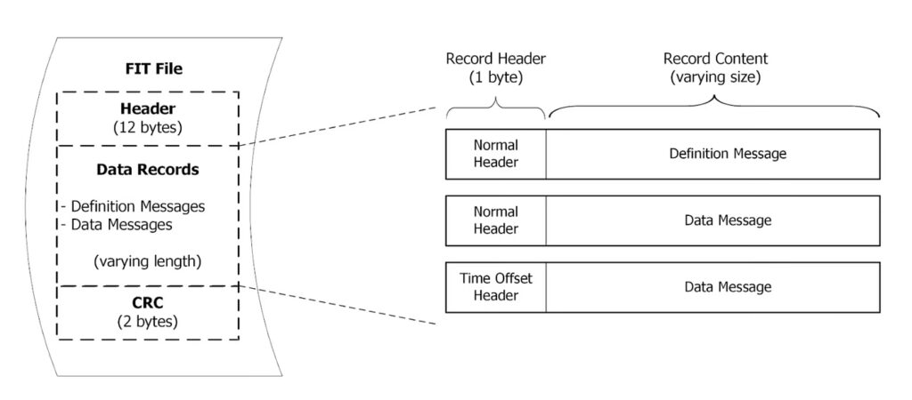 FIT está estructurado en mensajes que describen diferentes tipos de datos (mensajes de archivo, de actividad, de sesión, de vuelta, de registro, etc.). El mensaje de registro (Record) es donde se almacenan los datos momento a momento de la actividad, incluyendo coordenadas GPS, velocidad, distancia, frecuencia cardíaca, potencia, etc.