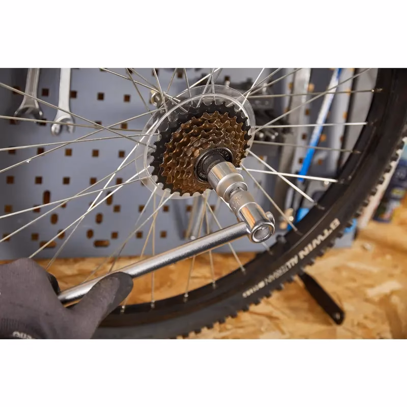 El extractor de cassette por sí solo no te permite aplicar el torque necesario para aflojar el anillo de cierre, que a menudo está bastante apretado. Necesitarás una llave que encaje en el extremo del extractor. El extremo del extractor suele tener forma hexagonal o cuadrada para ser compatible con diferentes tipos de llave: