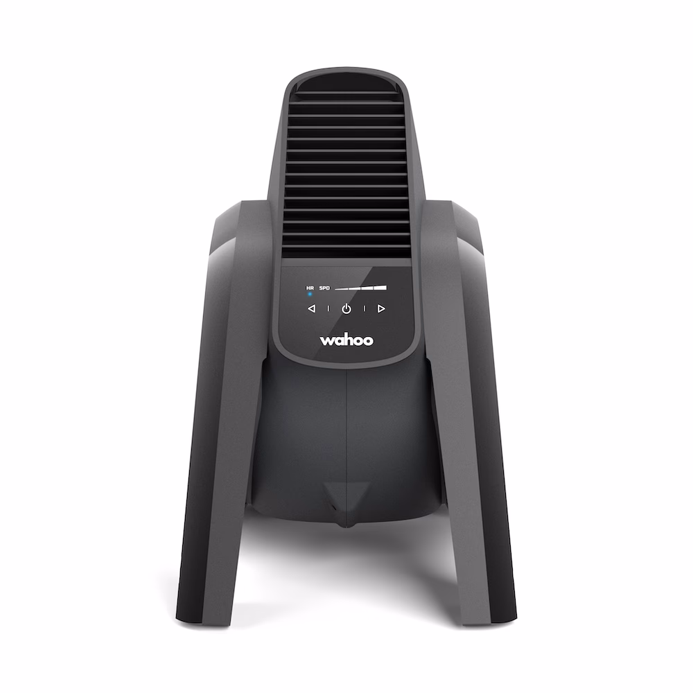 El KICKR HEADWIND es un ventilador inteligente que ajusta su velocidad automáticamente basándose en datos de sensores como tu velocidad virtual o tu frecuencia cardíaca. También tiene 4 velocidades manuales. Su diseño dirige el flujo de aire hacia tu cuerpo para una refrigeración efectiva durante el entrenamiento indoor.