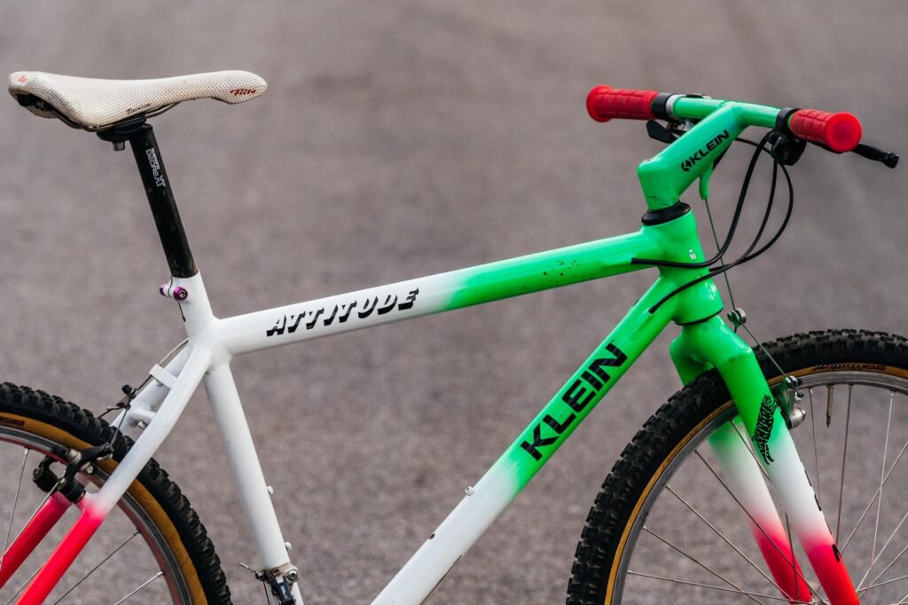 La bicicleta original, una Klein Pinnacle de 1987 de un distintivo color verde, estaba equipada con componentes principalmente Suntour XC Pro, un manillar y potencia de una pieza Klein Mission Control, pedales con rastrales, un sillín de gel Avocet y una horquilla rígida negra de cromoly. Curiosamente, esta horquilla estuvo instalada al revés durante una parte considerable del tiempo en pantalla. Lamentablemente, la Klein original fue robada del set en un punto, siendo reemplazada temporalmente por una Cannondale azul como “suplente”. Hoy en día, gracias a las plataformas de streaming y la redifusión, esta bicicleta sigue siendo vista casi a diario por nuevas generaciones.
