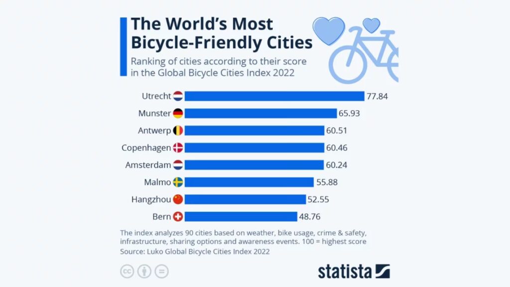 Empresas y organizaciones se dedican a evaluar y clasificar las ciudades según su amigabilidad con la bicicleta. Un ejemplo destacado es el ranking elaborado anualmente por la empresa de diseño danesa Copenhagenize, que utiliza un índice basado en una puntuación para cada una de 13 categorías distintas. Estos criterios son exhaustivos y buscan capturar la esencia de un entorno ciclista óptimo. Entre los factores que se tienen en cuenta se encuentran: