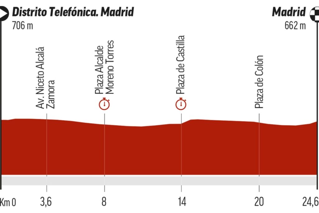 El perfil exacto del recorrido (llano, ondulado, con repechos) no se ha especificado, pero tradicionalmente las contrarrelojes finales de las Grandes Vueltas suelen ser predominantemente llanas o con ligeras ondulaciones, diseñadas para que los ciclistas de alta potencia y buena posición aerodinámica puedan brillar. Esto favorece a los rodadores y a los corredores de la General que han trabajado específicamente esta disciplina.