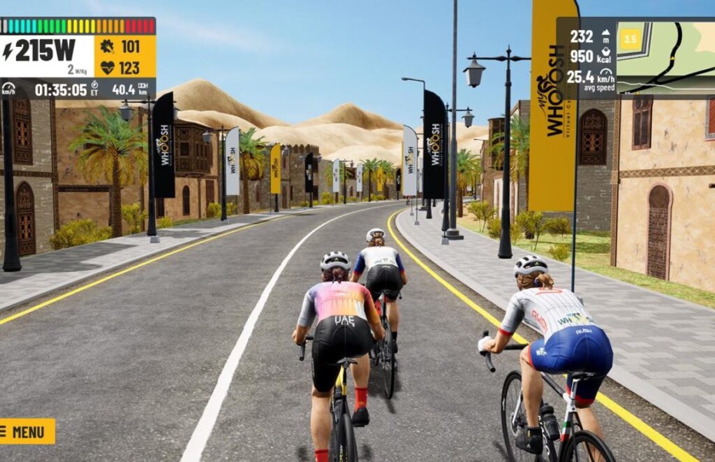 Sin duda, la plataforma con sede en los Emiratos Árabes Unidos es la que más seriamente se perfila como la principal competidora de Zwift, llegando incluso a arrebatarle la organización de los Campeonatos del Mundo de Ciclismo Indoor de la UCI. En términos generales, MyWhoosh guarda muchas similitudes con Zwift. Ofrece un entorno multijugador donde puedes pedalear junto a otros ciclistas, participar en eventos y seguir planes de entrenamiento.